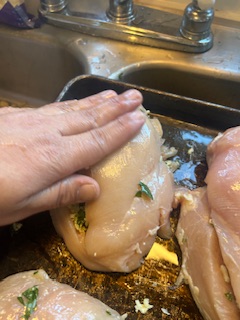 I lightly oil my hands and rub the tops of the chicken breasts