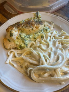 CHEESY SPINACH STUFFED CHICKEN BREASTS served WITH FETTUCCINE ALFREDO