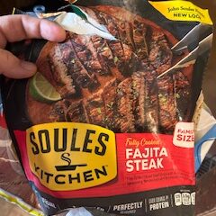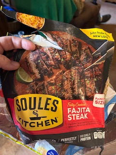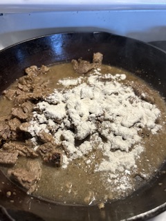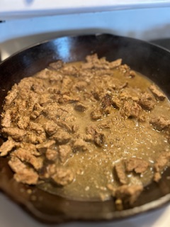 Take your fajita steak and put into cast iron skillet with a tad bit of oil, fry on med low heat then add some water and put lid over with heat turned down to let it get tender.. (I also use kitchen sheers and cut the steak into bite size pieces) then take lid off and ad a little flour, maybe 2 tbsps. and stir well add in a little water ..put lid on and turn to lowest heat (simmer) and finish your Sauce.