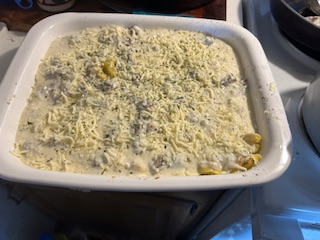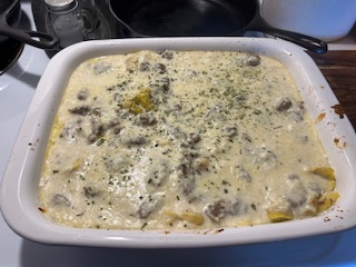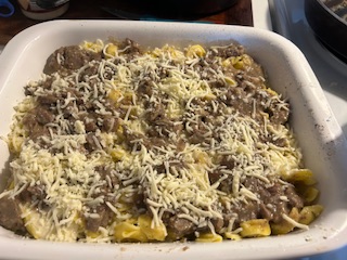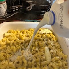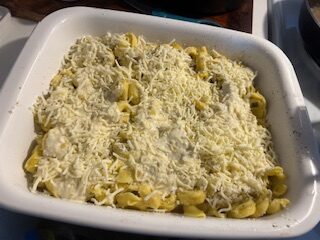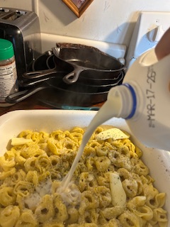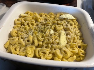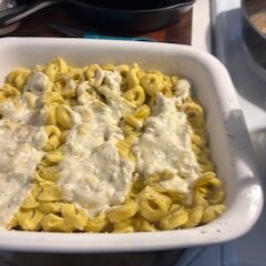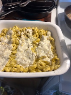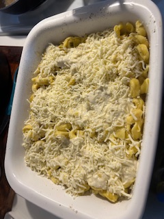 place your tortellini in the dish. add slivers of butter around top.. then pour some milk in ( not sure how much to tell ya) then I sprinkle parmesan cheese over top the hot tortellini add three good ladles of sauce over top of your noodles add a sprinkle of mozzarella cheese