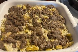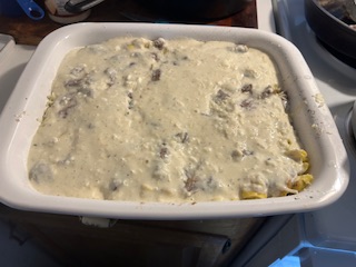 then add your meat and gravy followed by a layer of mozzarella cheese