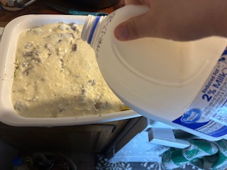 top with all of the sauce you have left, then I drop a couple drops of milk over top. and top the whole thing with a light layer of mozzarella cheese