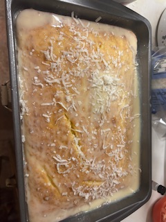 and throw in a pinch of sweetened coconut. Bake in 9×13