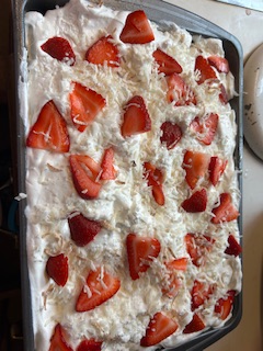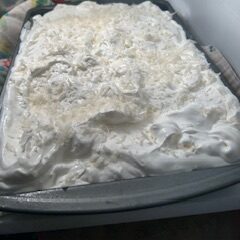 then I put a little sweetened coconut on top of cake – not too much just a little and I put cool whip over top of that. then another thin layer of coconut.. thin is the key! this is not a heavy cake!
