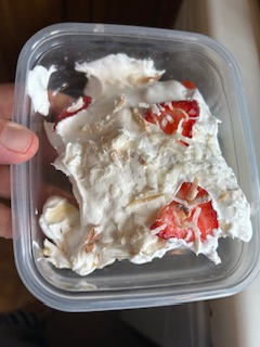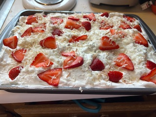 I slice some strawberries very thin and decorate the top then I add a little of the toasted coconut just for decoration.. I didn’t use all of my toasted coconut.. just enough to make it pretty!