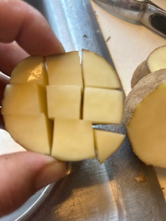 take washed potatoes and cut them all to about even thickness so all cook and get done at same time. Score with knife one side of the potato in criss cross pattern.
