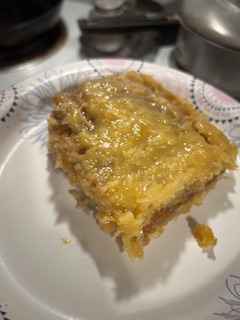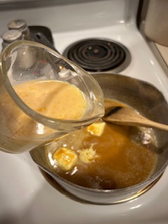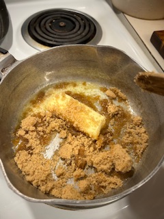 Melt butter in saucepan with brown sugar, have eggs milk and vanilla mixed together in measuring cup, pour in over sugar and quickly take off heat and mix with wooden spoon to incorporate off burner to temper eggs .,, once mixed well, can place back on low heat and add in cup of coconut and nuts if desire.. turn off heat and pour over cake and bake for 5 more minutes.