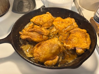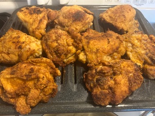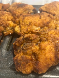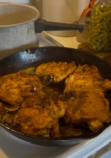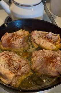 Do not crowd! Brown your chicken and cook slowly turning when one side is good and crispy. add a little more seasoning if desire, Paprika, a little salt and pepper.