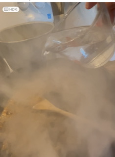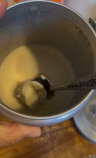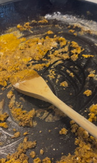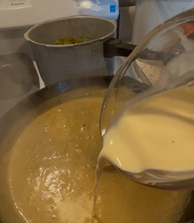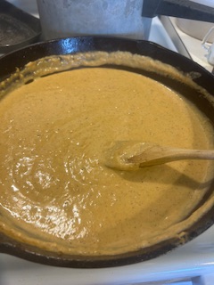 Stirring continuously till mixture bubbles. Stir in 1 cup of water to start with.. stirring well then 1 cup milk (Evaporated milk is best or can use regular milk)