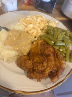 when chicken comes out let it rest and enjoy with green beans, mashed potatoes with gravy over it and some homemade macaroni and cheese. Yeasty rolls or homemade biscuits will complete your meal.