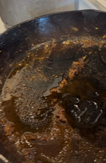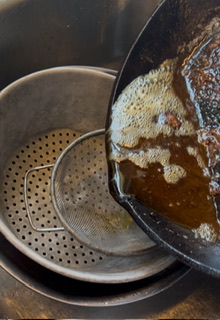 Pour all of drippings into metal strainer that is in metal bowl (be sure to leave the little brown crusty bits in your skillet) Remove the garlic pieces and bay leaves.