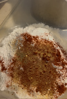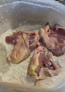 Combine flour salt paprika pepper and garlic powder in clean brown paper bag ( can just use bowl) Shake chicken in a few pieces at a time in flour mixture till coated well.